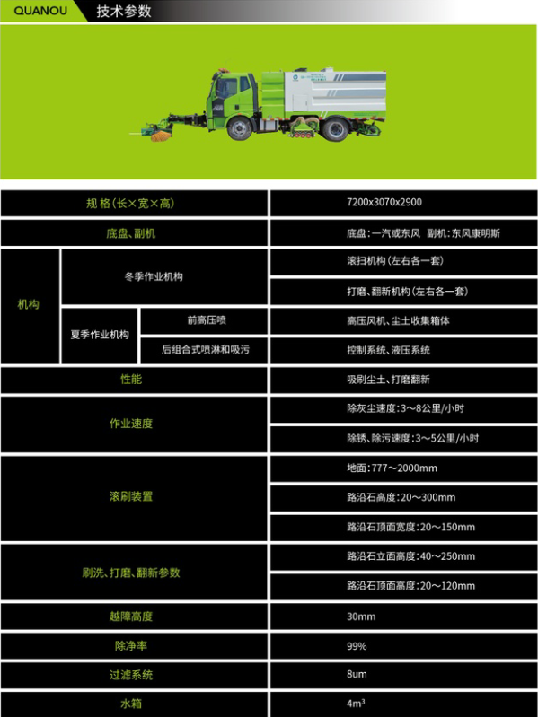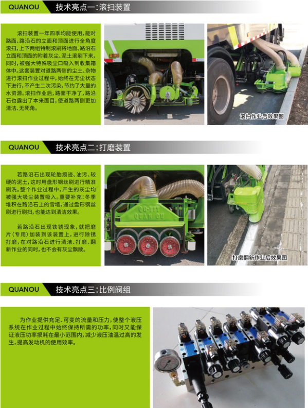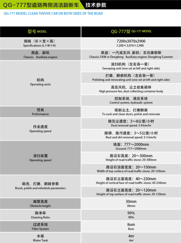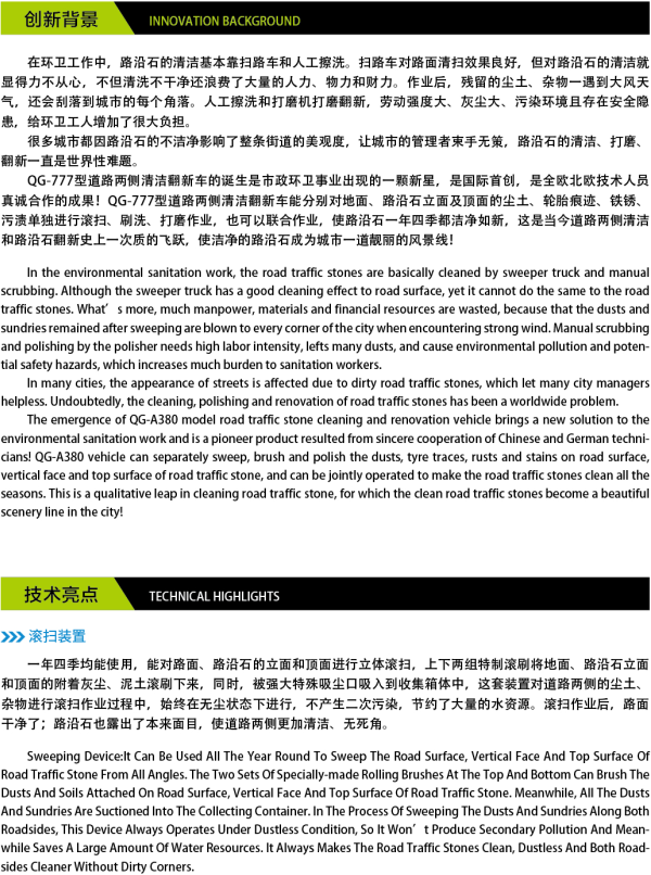 QG-777型道路两侧清洁翻新车:①一键控制系统,简单易懂,方便操作②一年四季均能使用③不产生二次污染④特制过滤系统大于8微米尘粒不会排到外界。